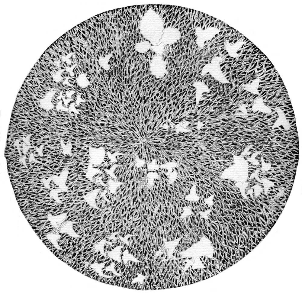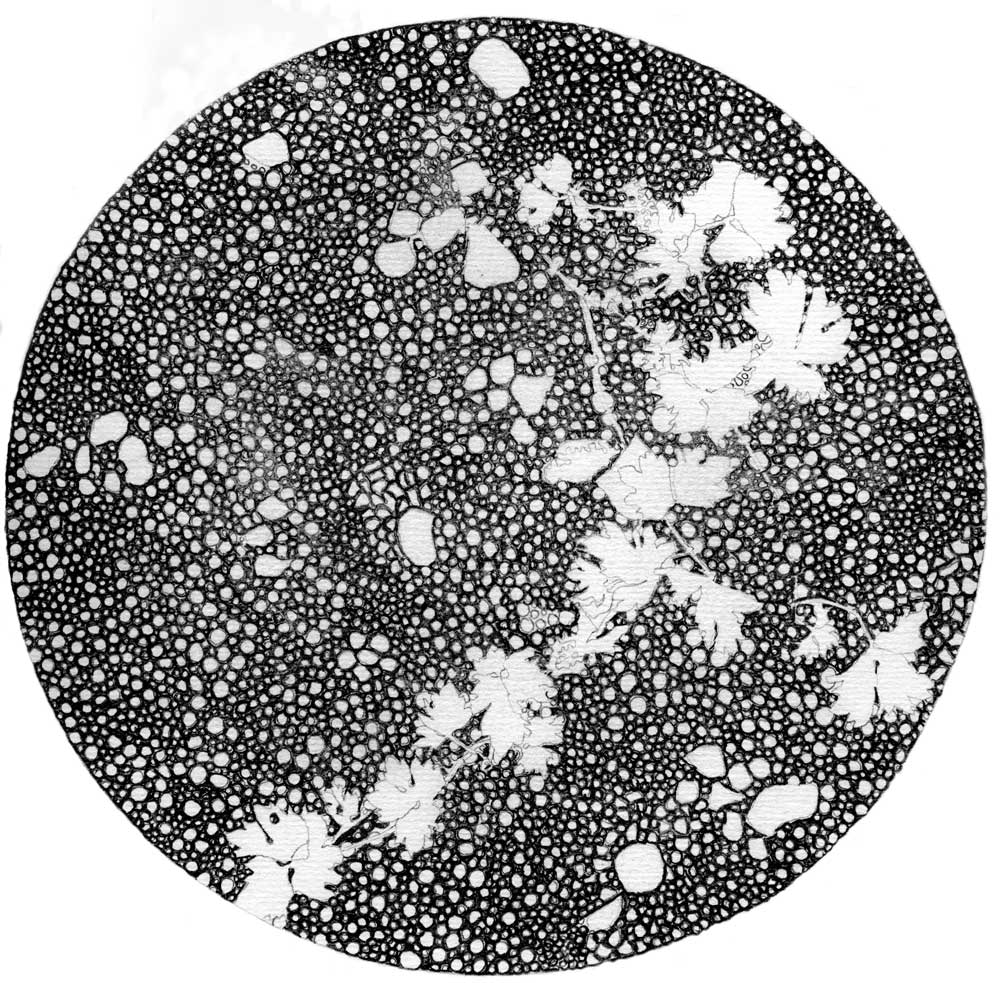A multiple of twenty olde-skool pencil and paper nature study drawings. Each drawing is 8.25 inches in diameter and represents the first close up view of the Earths planetary surface as seen through the approaching motherships telescope. As the mothership is still many light years away these intergalactic images are not intended as definitive, but rather to inform other life forms of the contemporary context prior to their arrival.